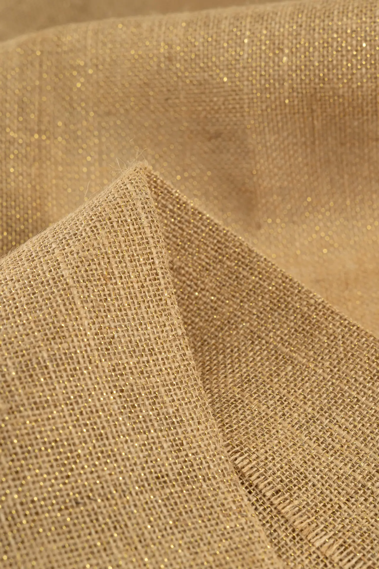 Tejido confeccionado en combinación de fibras naturales (yute) y de cadena larga (lurex).