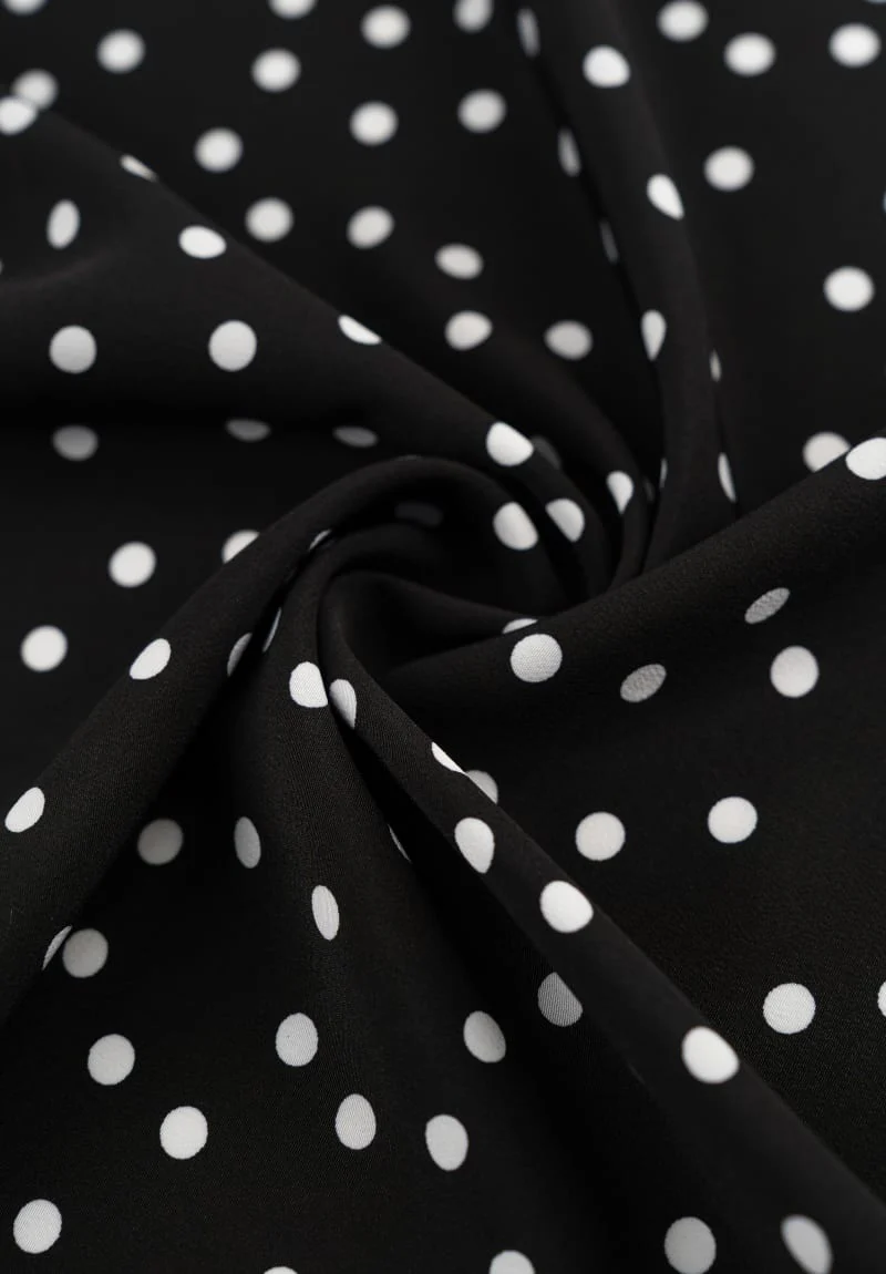 Su textura característica aporta un tacto agradable y facilita la confección, siendo perfecto para vestidos, blusas o faldas. El contraste de los lunares blancos sobre fondo negro aporta un estilo clásico y muy favorecedor.