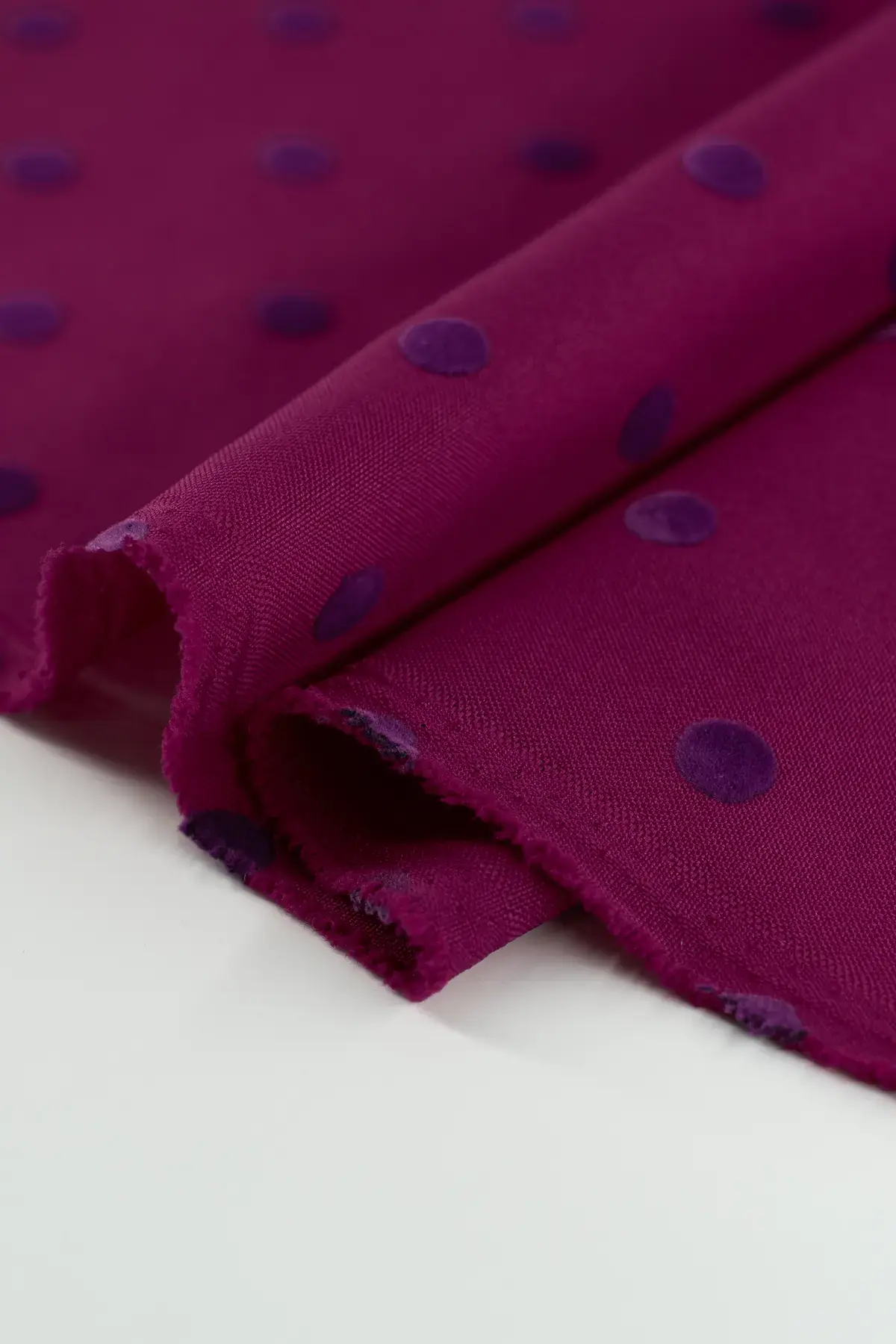 Tejido confeccionado en fibras de cadena larga, y lunar flocado en color buganvilla